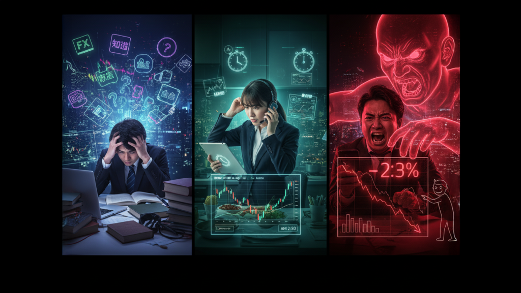 投資の世界で最も難しいのが、メンタルのコントロールです。相場が急落した時にパニックになって売ってしまったり(狼狽売り)、少し利益が出たからと欲を出して売るタイミングを逃したり(利確の遅れ)。「もっと上がるはず」「早く損を取り返したい」といった感情的な判断は、しばしば合理的な判断を曇らせ、大きな損失に繋がります。冷静さを保ち続けることは、プロのトレーダーにとっても至難の業なのです。