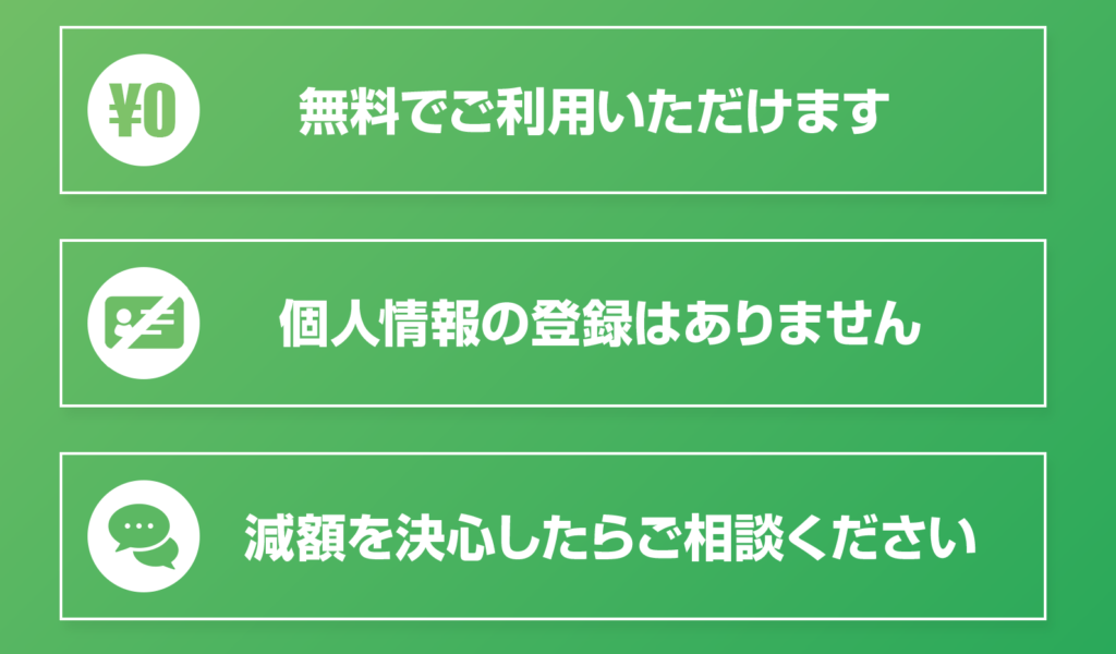 A2: はい、無料です。減額診断は、法律事務所や司法書士事務所が、借金に悩む方への相談の入り口として提供しているサービスです。診断を利用したからといって、正式に依頼する義務は一切ありませんし、後から料金を請求されることもありませんので、安心してご利用ください。