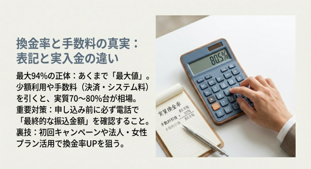 さて、ここからは少しシビアなお話、つまり「いくら払っていくら戻ってくるのか」という換金率と手数料のリアルについてお伝えします。公式サイトを開くと「換金率最大94%!」といった非常に魅力的な数字が飛び込んできますが、これはあくまで「最大」であることを忘れてはいけません。