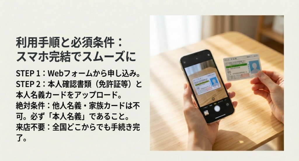 公式サイトの申し込みフォームに、氏名、電話番号、メールアドレス、希望金額などを入力して送信するだけ。その後、スタッフから内容確認の連絡が来ますが、それも電話一本で済みます。必要書類(身分証)の提出も、スマホで写真を撮ってメールや専用フォームで送るだけなので、コピーを取って郵送するような手間は一切ありません。
