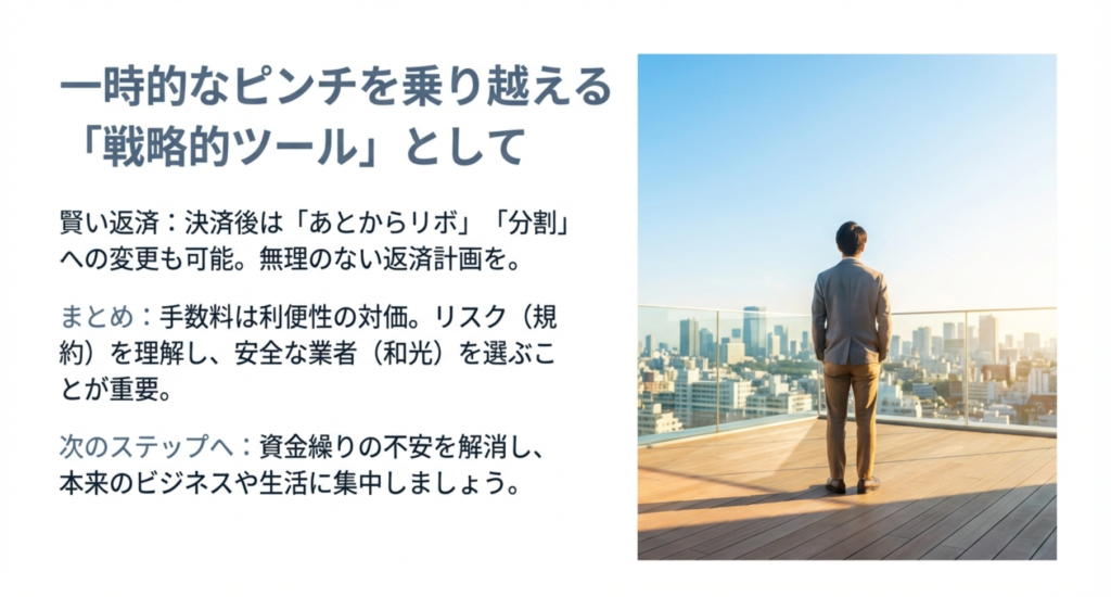 最後に、和光クレジットを使うことで得られる、資金調達以上のメリットについてお話しします。単にお金が手に入るだけでなく、その後の生活やビジネスを支える仕組みが整っています。