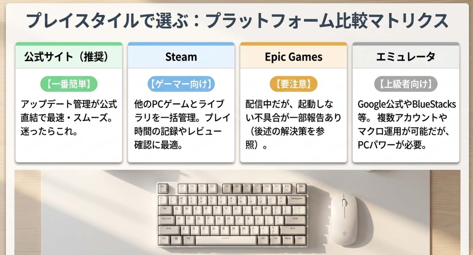 鳴潮をPCで楽しむためには、複数のプラットフォームが用意されています。ここでは、それぞれのダウンロード方法や、私が気になった注意点について詳しく掘り下げていきますね。
