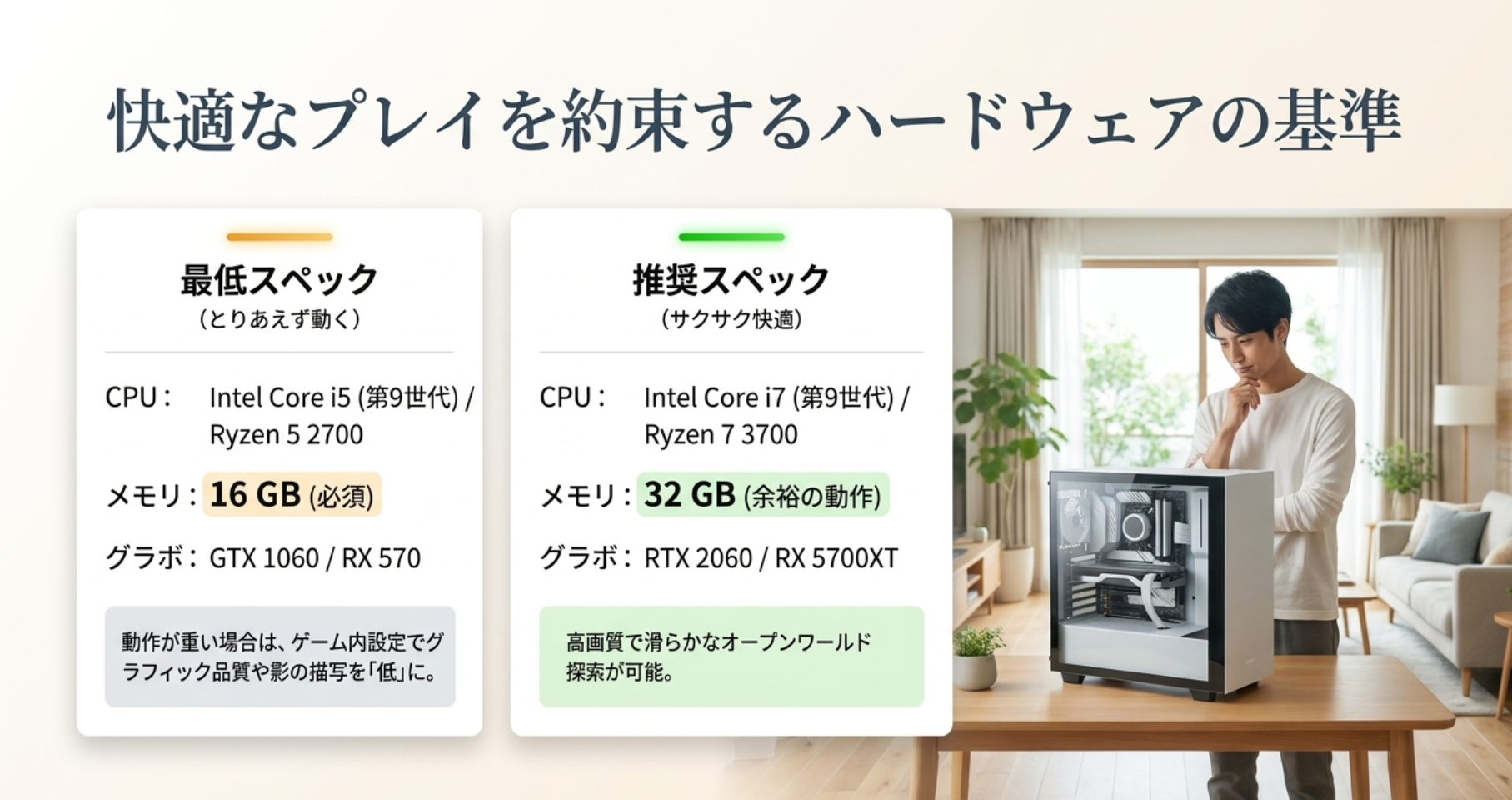 最低スペックでもメモリ16GBが要求されている点は、最近のゲームらしい重厚さを感じますね。もし動作が重いと感じる場合は、ゲーム内の設定からグラフィック品質を「低」に下げることで、ある程度改善されるはずです。特に影の描写やアンチエイリアスを調整するだけでも、フレームレートが安定しやすくなりますよ。