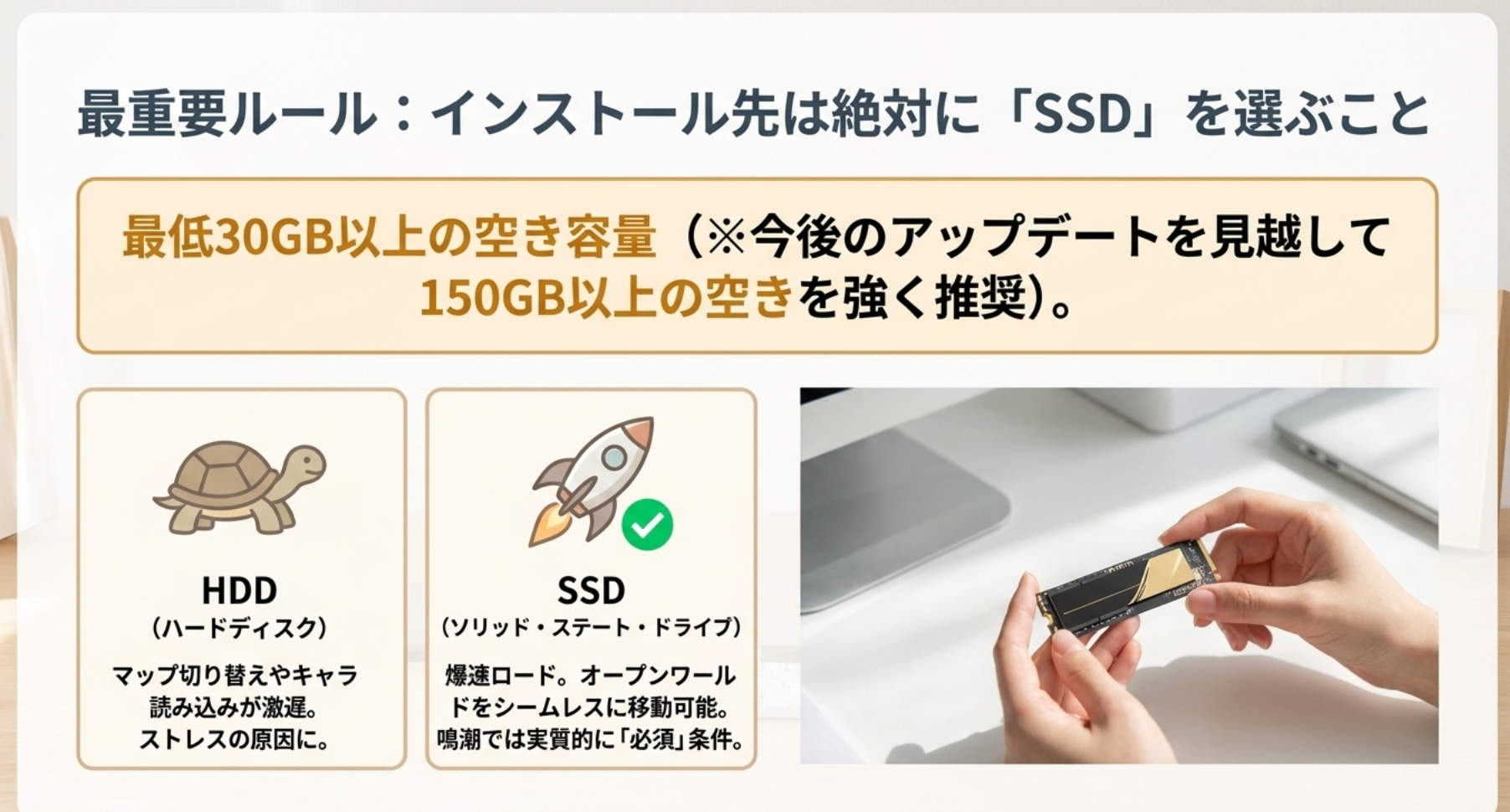 また、HDD(ハードディスク)ではなくSSD(ソリッド・ステート・ドライブ)へのインストールを強くおすすめします。マップの切り替えやキャラクターの読み込み速度が劇的に変わるので、ストレスなく遊びたいならSSD一択ですね。