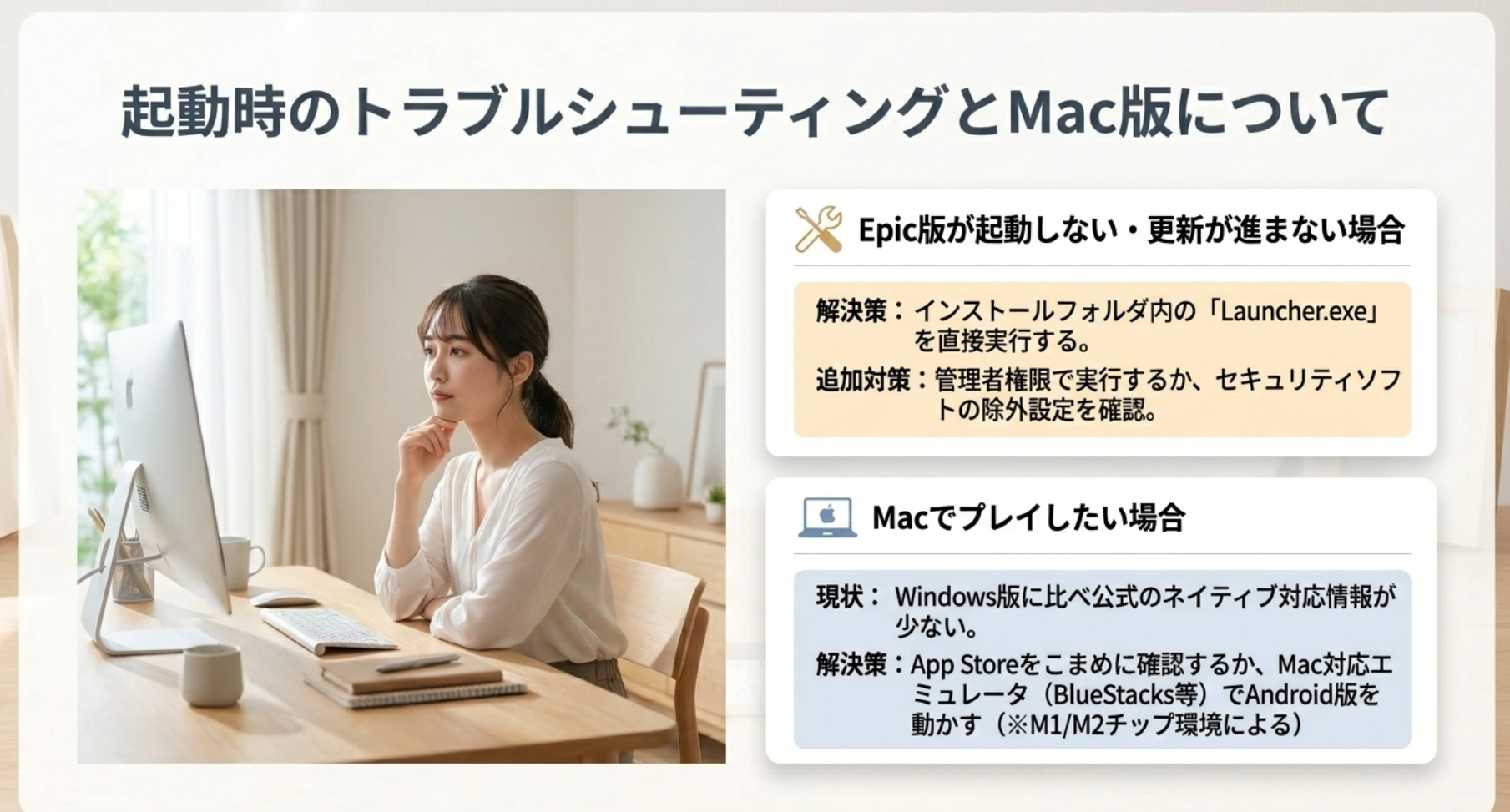 もしEpic版で不具合に遭遇した場合は、インストールフォルダ内にある「Launcher.exe」を直接実行するという裏ワザ的な対処法があるそうです。Epicのクライアントを通さずに、ゲーム自体のランチャーを直接叩くイメージですね。それでもダメな場合は、一度管理者権限で実行してみる、あるいはセキュリティソフトの除外設定に加えるといった対策を検討してみてください。焦らず一つずつ試していけば、きっと解決の糸口が見つかるはずです。