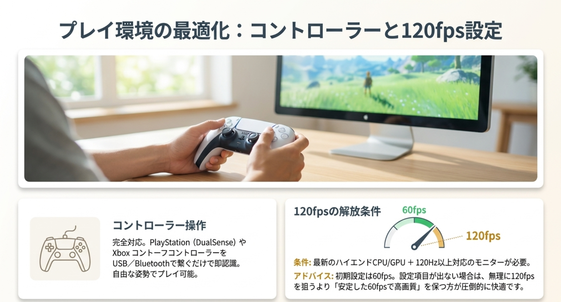 もし120fpsの設定項目が出てこない場合は、無理に設定を弄るよりも、安定した60fpsで画質を高く保つ方が快適に遊べるかもしれません。自分の環境に合わせた最適なバランスを見つけるのも、PCゲームの楽しみの一つですね。
