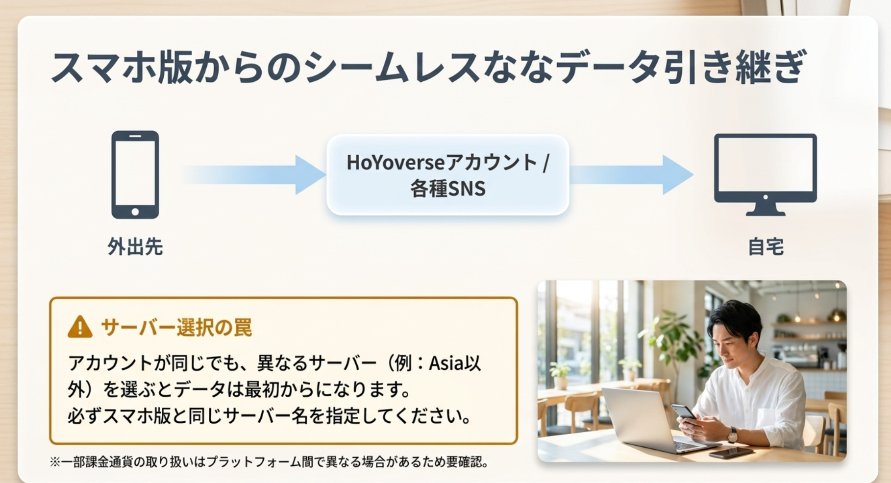 「外出先ではスマホで、家ではPCでじっくり」という遊び方ができるのが鳴潮の素晴らしい点です。データ連携は、HoYoverseアカウント(または各SNS連携)を通じて行われます。