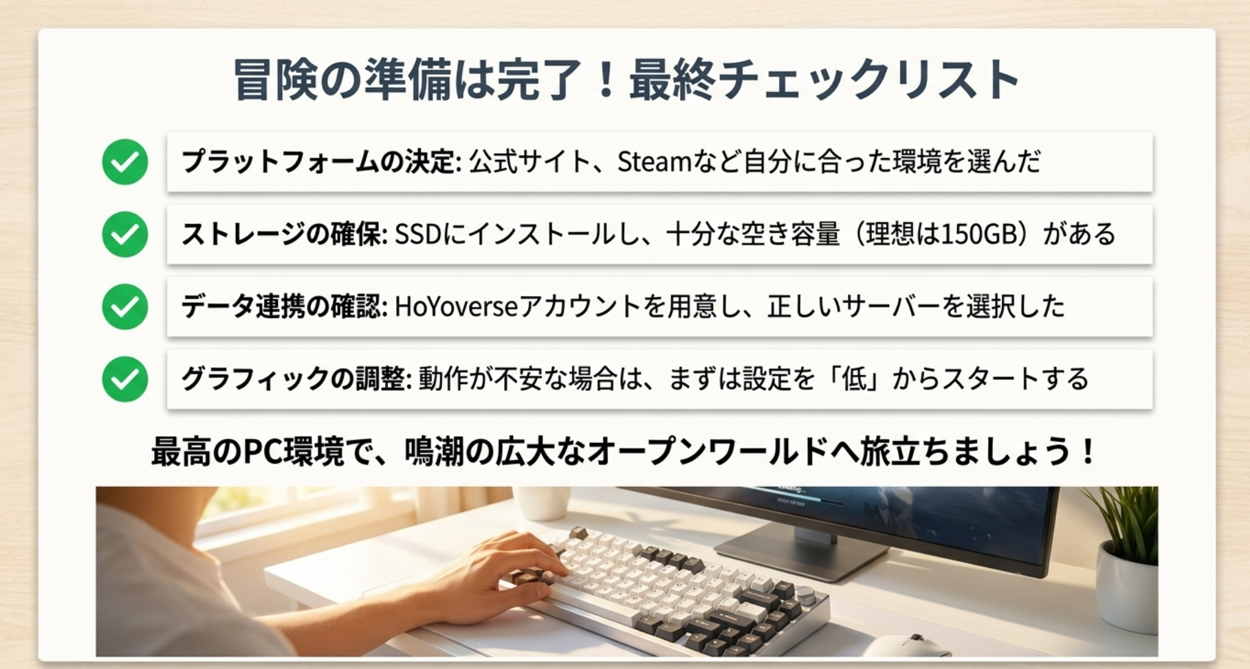 ここまで、鳴潮をPC版で遊び始めるためのダウンロード方法や、動作環境、トラブル対処法についてお伝えしてきました。PCの大画面で広大なオープンワールドを駆け巡る体験は、スマホとはまた違った感動を与えてくれます。